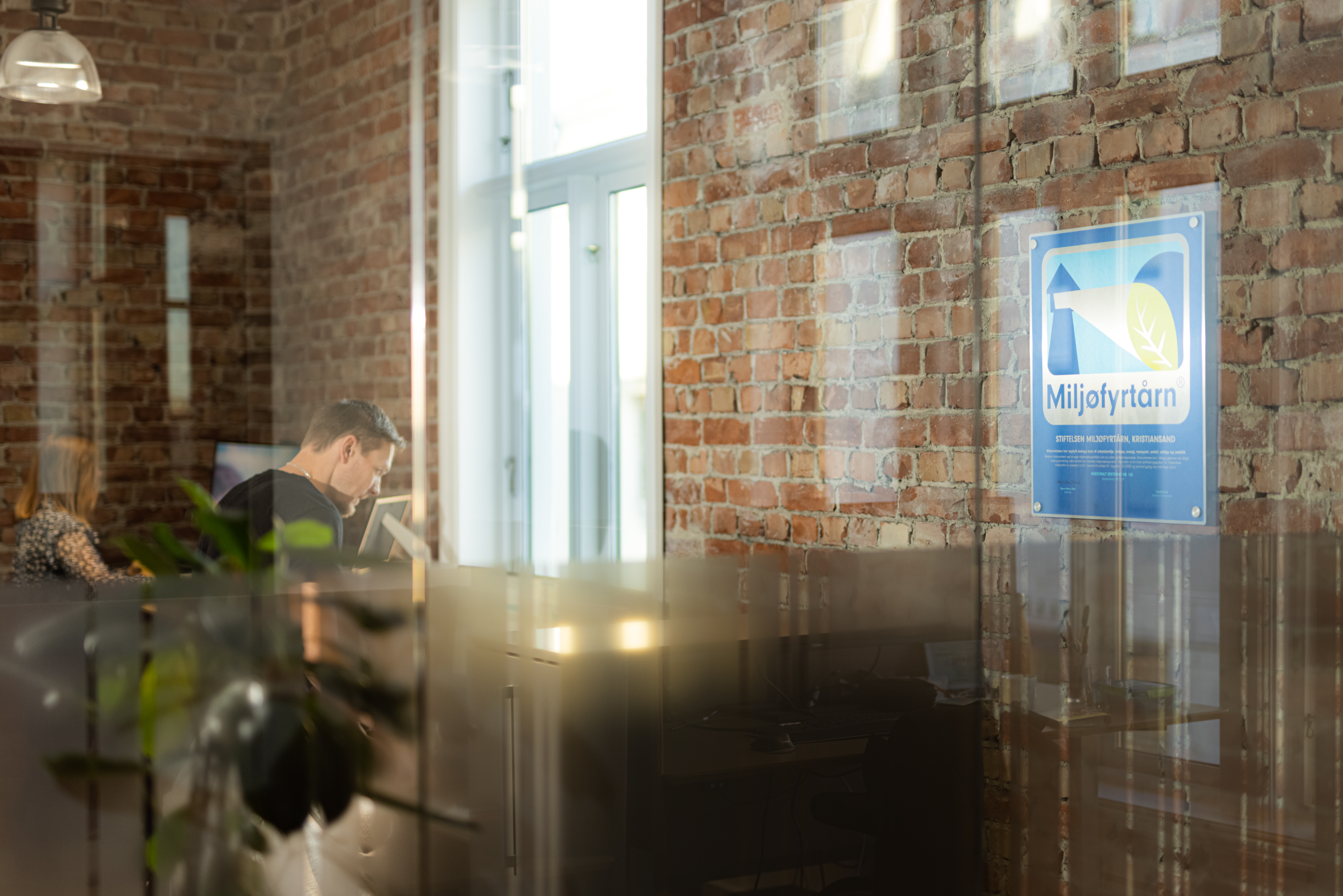 Bilde av Miljøfyrtårndiplom hengende i kontorlandskap og det skimtes en mann foran PC
