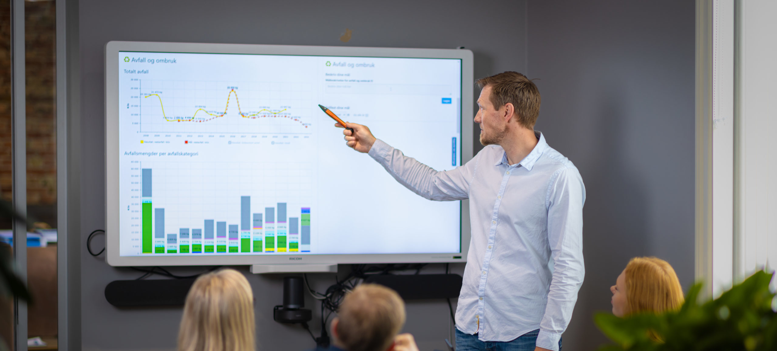 Bilde av mann som peker på grafer på skjerm foran et møtebord med mennesker
