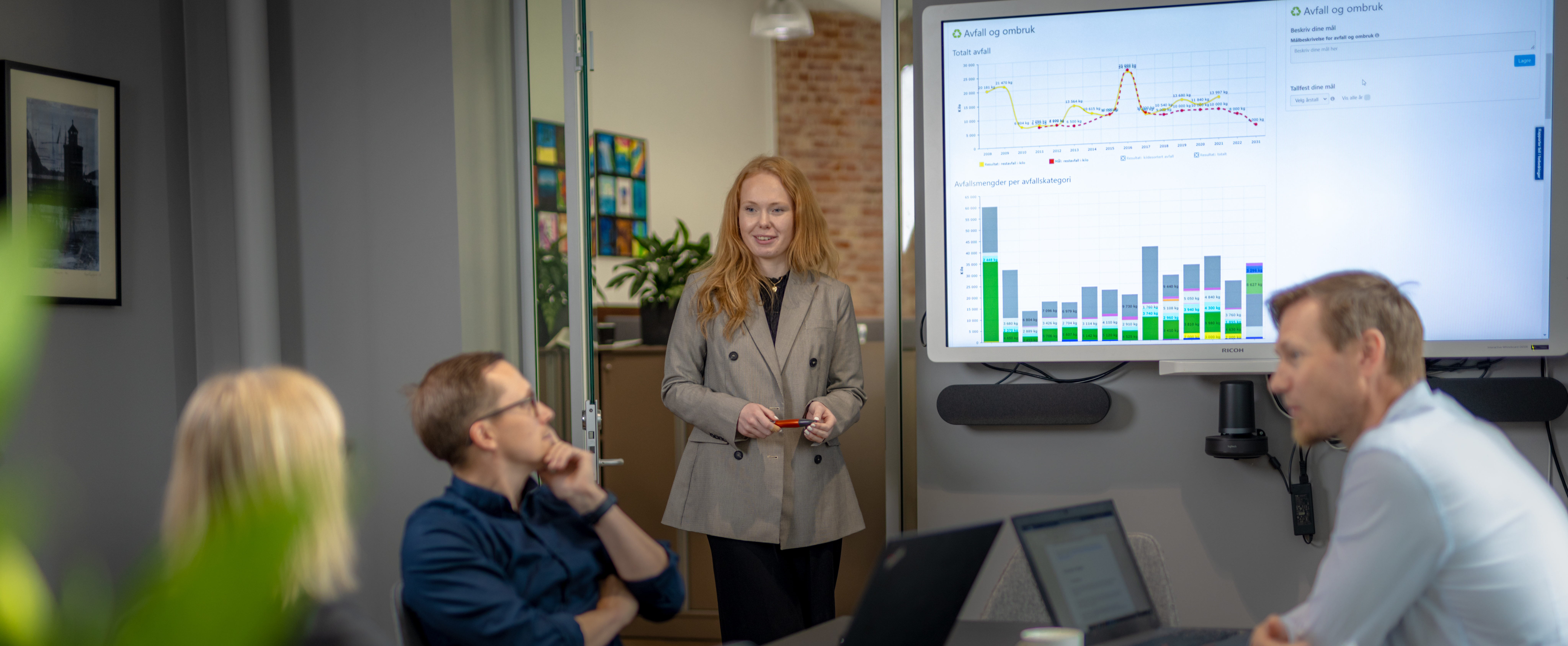 Bilde av dame står ved siden av en skjerm med grafer foran et møtebord med mennesker