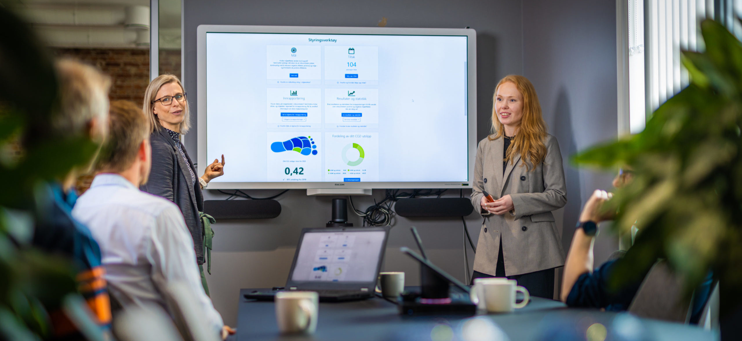 To damer som presenterer på skjerm foran et møtebord med mennesker