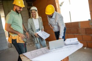 A,Group,Of,Architects,Work,Together,On-site,,Discussing,Blueprints,And