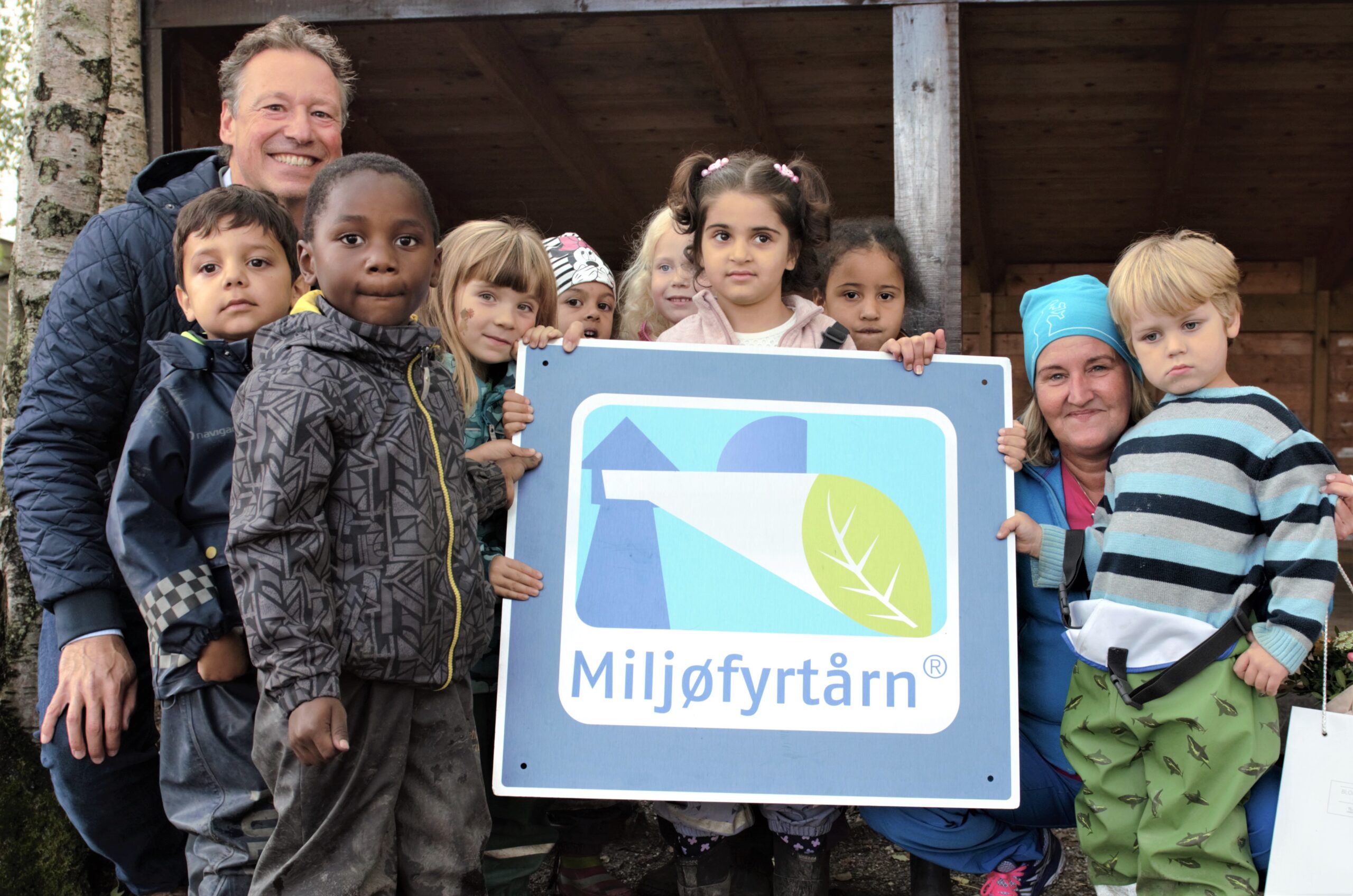 Barn i barnehagen står oppstilt og holder frem Miljøfyrtårn-diplom