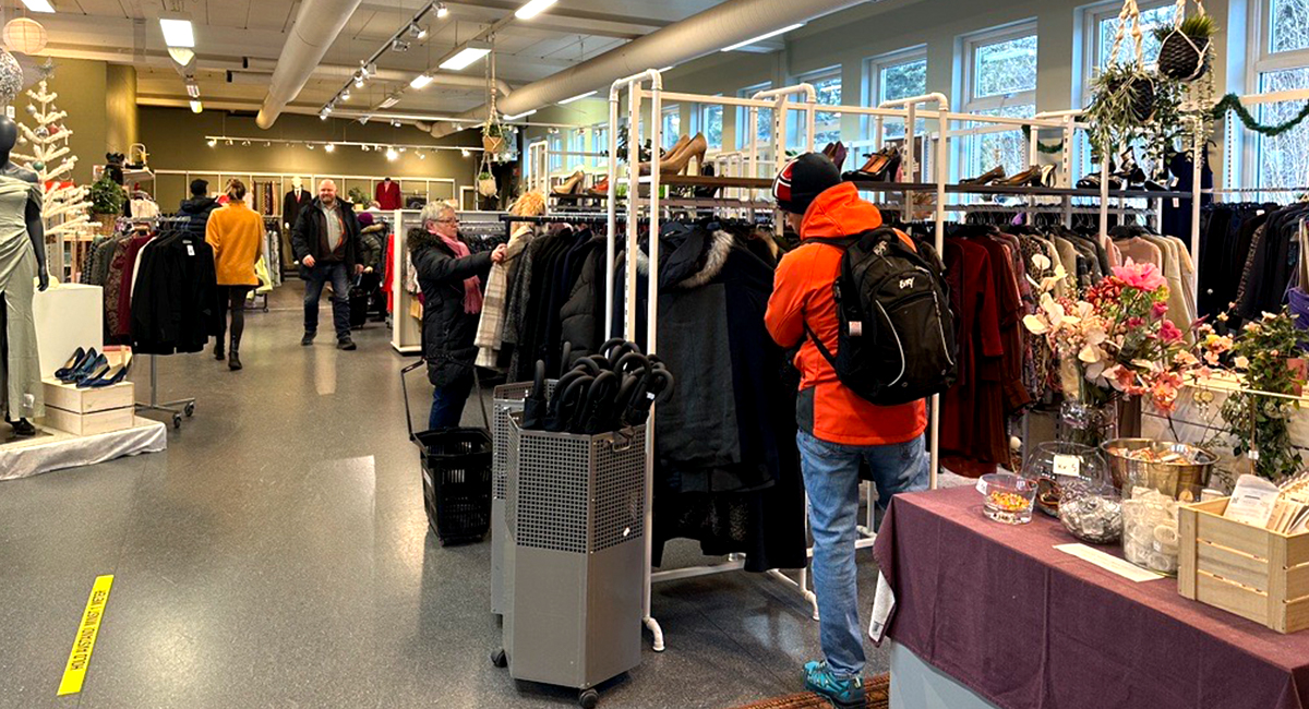 Bilde fra Fretex-butikk med mennesker som kikker på klær