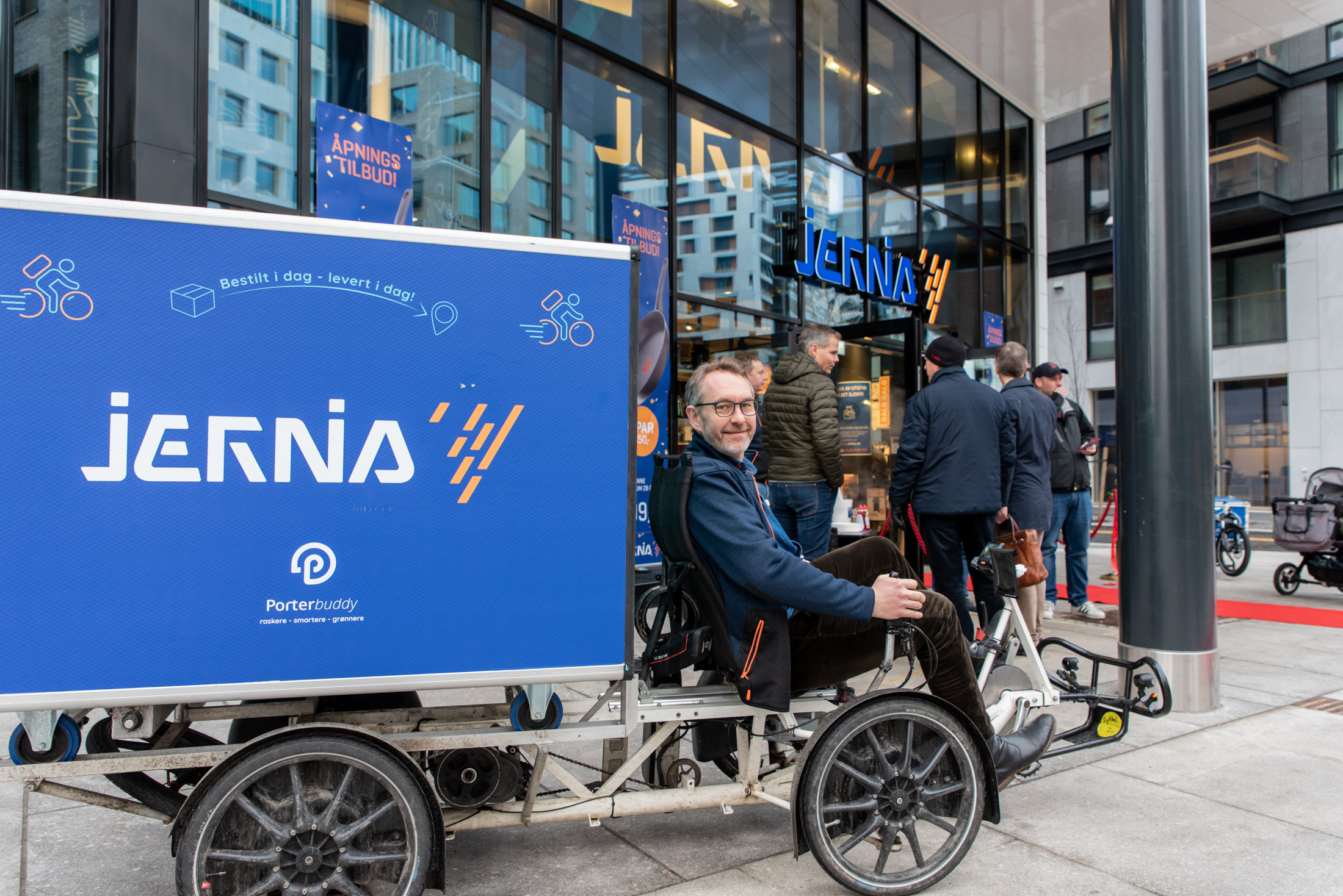 Jernia-sjefen kjører en tilhenger med Jernia-varer