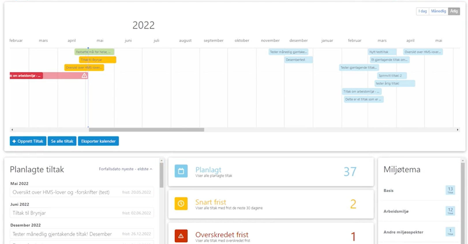 Skjermbilde av tiltaksoversikt fra Miljøfyrtårns styringsverktøy
