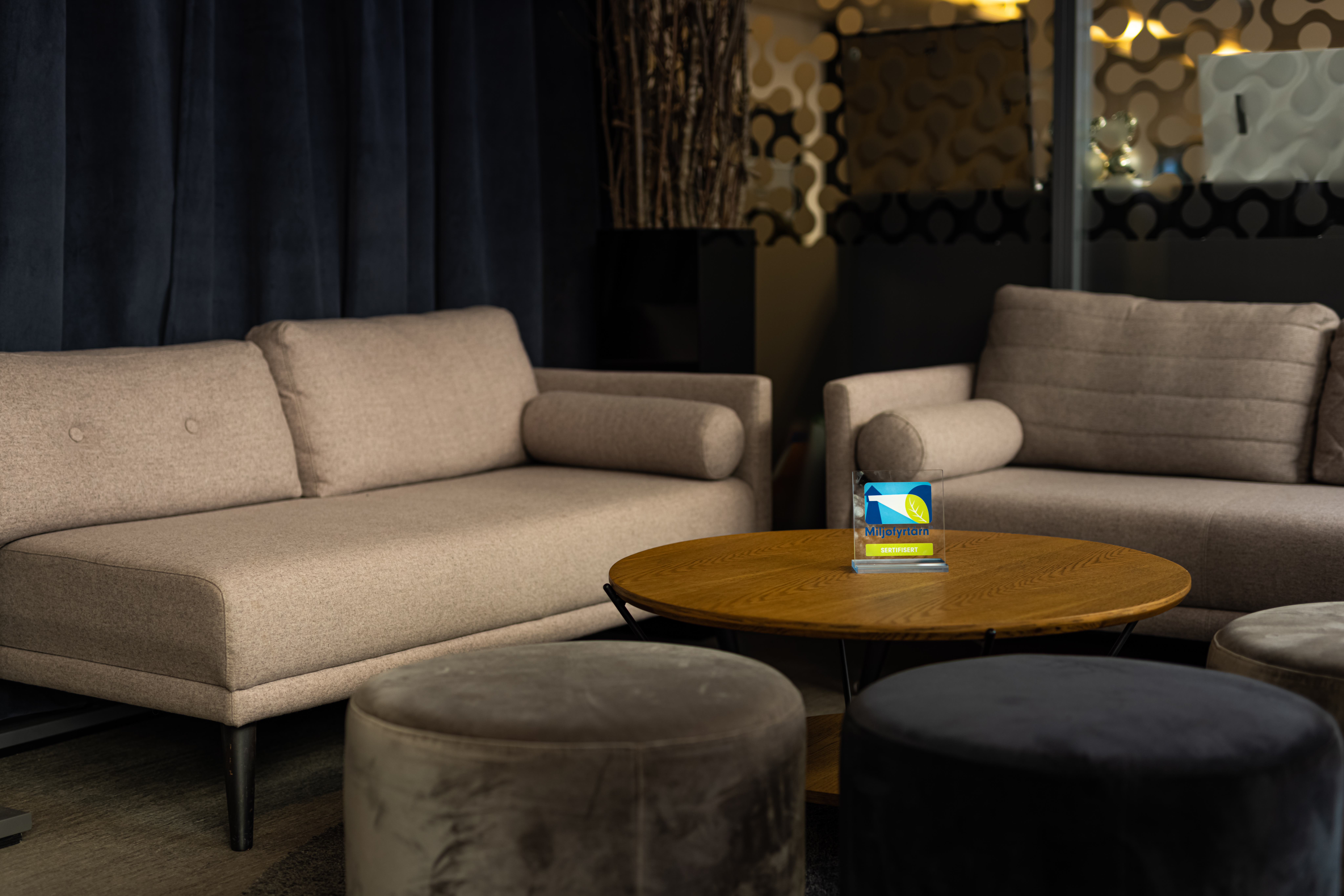 Bilde av et Miljøfyrtårn pleksiplakett på bord