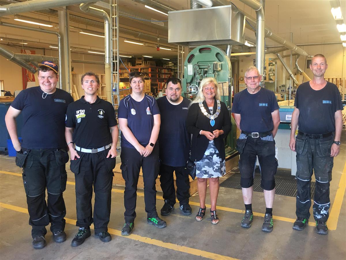 6 ar6 arbeidere står oppstilt med ordfører for kamera i arbeidslokaler